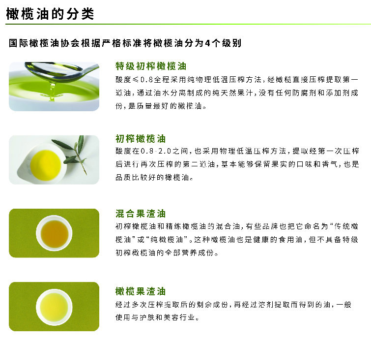 國際橄欖油協(xié)會根據(jù)嚴(yán)格標(biāo)準(zhǔn)將橄欖油分為4個(gè)級別: